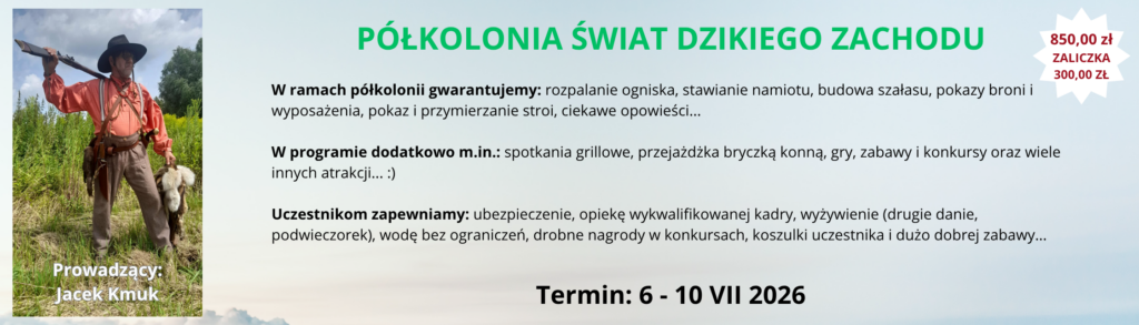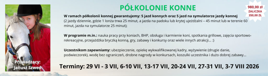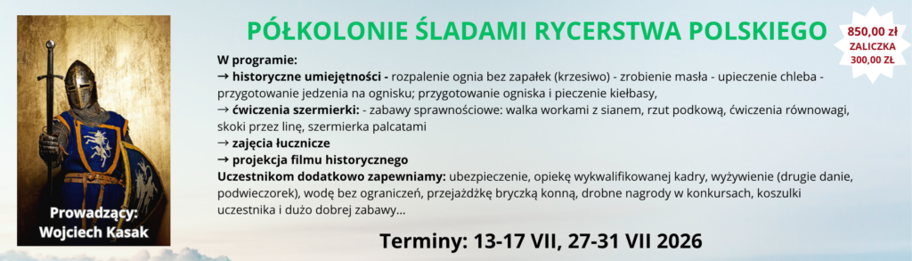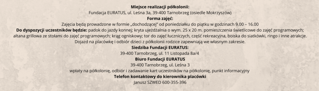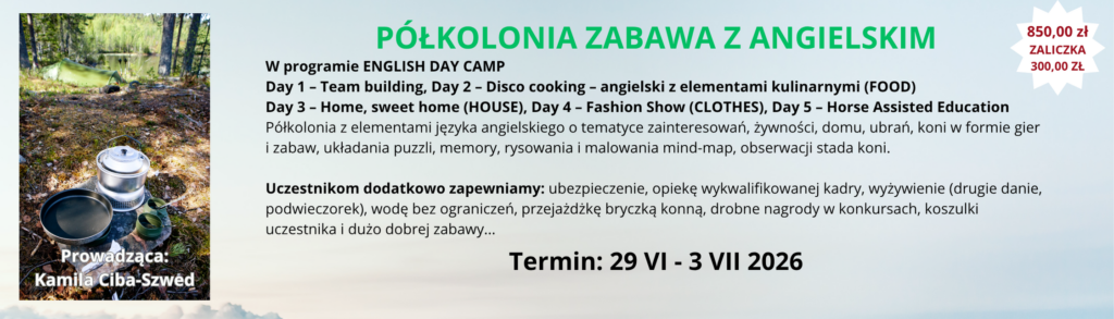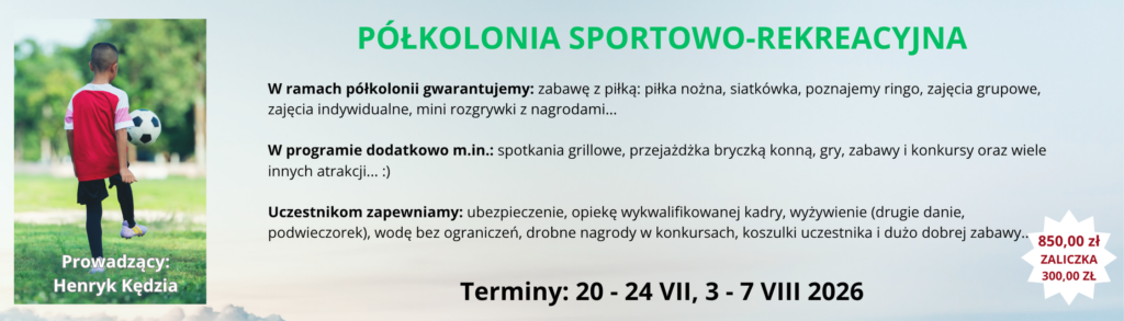 RUSZAMY Z REKRUTACJĄ NA LETNIE PÓŁKOLONIE 2026 REKRUTACJA PONIŻEJ I TURNUS 29 CZERWCA - 3 LIPCA 2026 Półkolonia Konna - Fundacja EURATUS - 5 DNI - 980,00 ZŁ ZOBACZ KTO SIĘ ZAPISAŁ ZAPISZ SIĘ Półkolonia Zabawa z angielskim - Fundacja EURATUS - 5 DNI - 850,00 ZŁ ZOBACZ KTO SIĘ ZAPISAŁ ZAPISZ SIĘ II TURNUS 6 - 10 LIPCA 2026 Półkolonia Konna - Fundacja EURATUS - 5 DNI - 980,00 ZŁ ZOBACZ KTO SIĘ ZAPISAŁ ZAPISZ SIĘ Półkolonia: Świat Dzikiego Zachodu - Fundacja EURATUS - 5 DNI - 850,00 ZŁ ZOBACZ KTO SIĘ ZAPISAŁ ZAPISZ SIĘ III TURNUS 13 - 17 LIPCA 2026 Półkolonia Konna - Fundacja EURATUS - 5 DNI - 980,00 ZŁ ZOBACZ KTO SIĘ ZAPISAŁ ZAPISZ SIĘ Półkolonia Śladami Rycerstwa Polskiego- Fundacja EURATUS - 5 DNI - 850,00 ZŁ ZOBACZ KTO SIĘ ZAPISAŁ ZAPISZ SIĘ IV TURNUS 20 - 24 LIPCA Półkolonia Konna - Fundacja EURATUS - 5 DNI - 980,00 ZŁ ZOBACZ KTO SIĘ ZAPISAŁ ZAPISZ SIĘ Półkolonia Sportowo-rekreacyjna - Fundacja EURATUS - 5 DNI - 850,00 ZŁ ZOBACZ KTO SIĘ ZAPISAŁ ZAPISZ SIĘ V TURNUS 27 - 31 LIPCA Półkolonia Konna - Fundacja EURATUS - 5 DNI - 980,00 ZŁ ZOBACZ KTO SIĘ ZAPISAŁ ZAPISZ SIĘ Półkolonia: Śladami rycerstwa polskiego - Fundacja EURATUS - 5 DNI - 850,00 ZŁ ZOBACZ KTO SIĘ ZAPISAŁ ZAPISZ SIĘ VI TURNUS 3 LIPCA - 7 SIERPNIA Półkolonia Konna - Fundacja EURATUS - 5 DNI - 980,00 ZŁ ZOBACZ KTO SIĘ ZAPISAŁ ZAPISZ SIĘ Półkolonia Sportowo-rekreacyjna - Fundacja EURATUS - 5 DNI - 850,00 ZŁ ZOBACZ KTO SIĘ ZAPISAŁ ZAPISZ SIĘ Rachunek bankowy 19 1090 2750 0000 0001 4877 8714 Szczegółowe informacje są przesyłane na adres mailowy wskazany przy rejestracji KARTA UCZESTNIKA OBOZU - jpg Przypominamy, że zaliczkę należy wpłacić do 7 dni od rejestracji, po tym terminie wpisy będą usuwane.